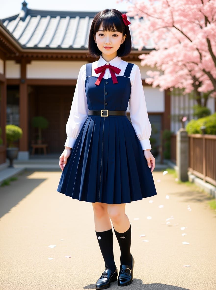 A full body portrait of an 18-year-old Japanese woman in a school uniform at a shrine. Spring sunlight and cherry blossoms create a beautiful scene.