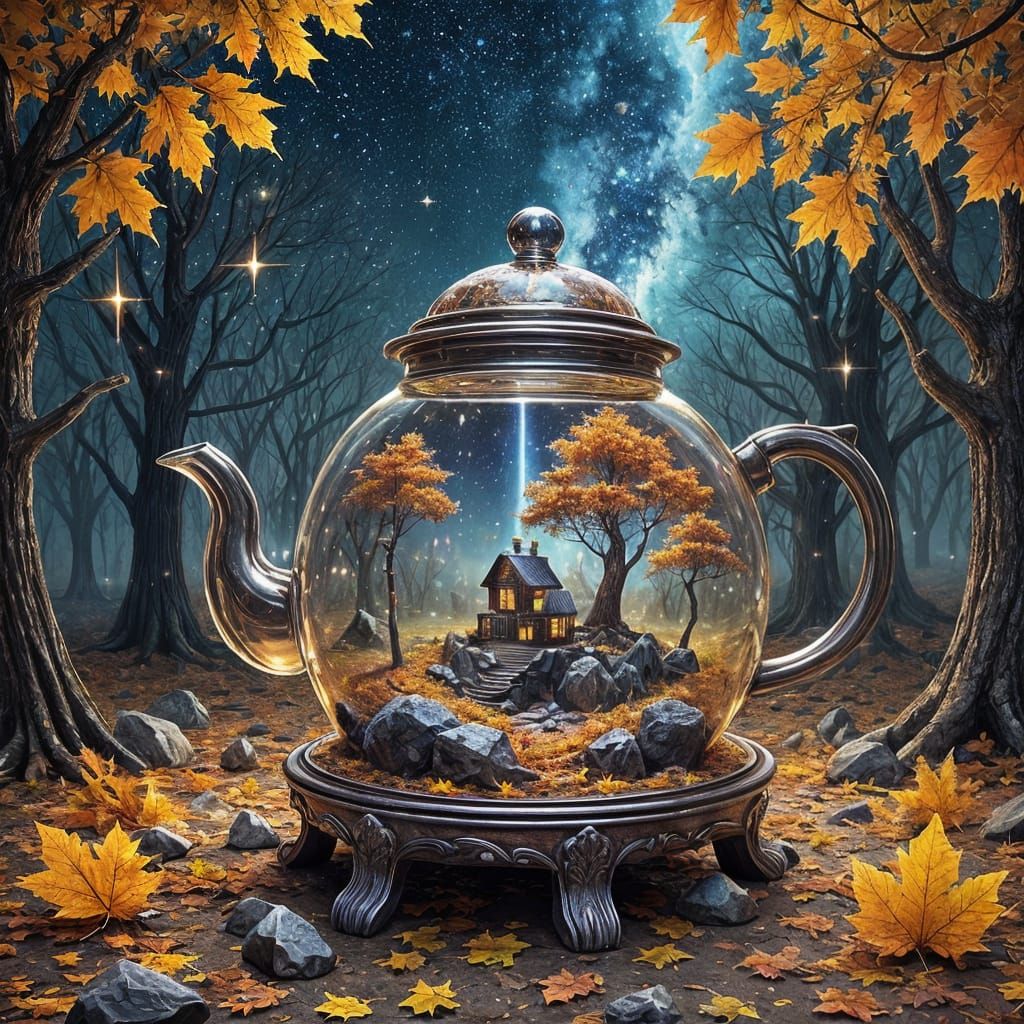 This image depicts a whimsical, highly detailed fantasy scene. A giant crystal teapot holds a miniature glowing autumn forest beneath a starry, cosmic sky.
