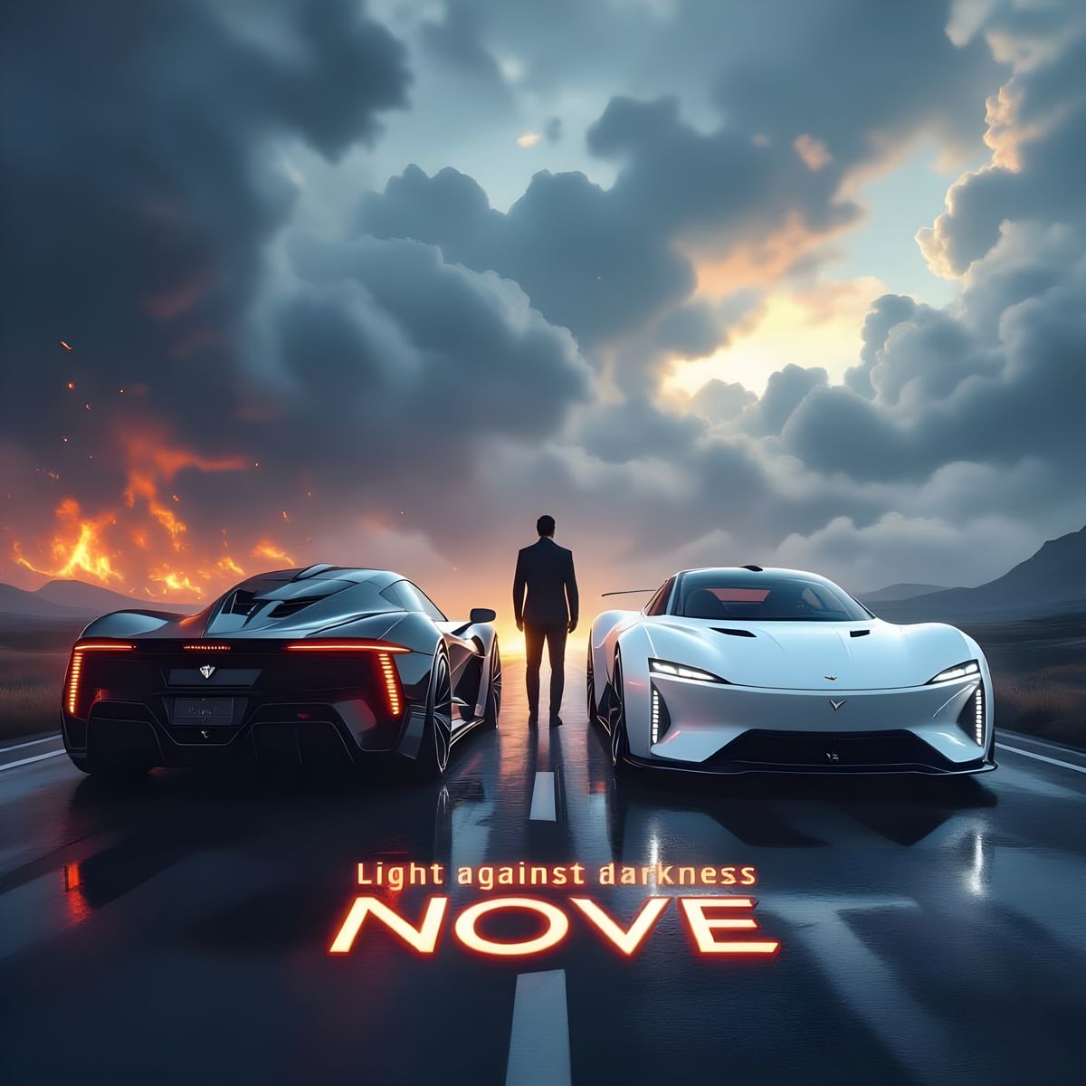 This image shows two futuristic hypercars, one black leaving fiery streaks and the other white with floral accents, facing off on a road divided by a devilish figure. Dynamic speed and contrasting themes are depicted.