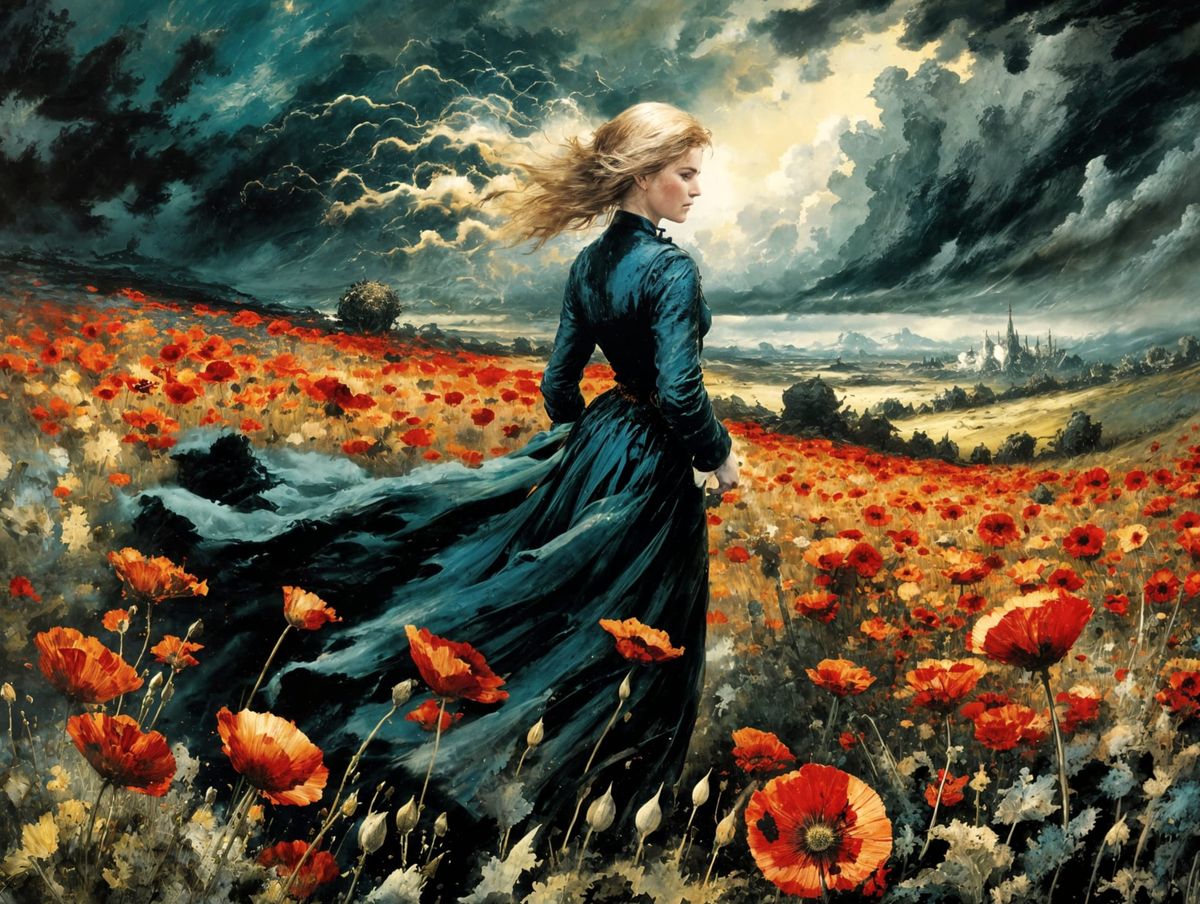Storm over the Poppy Field, with swirling Petals, by (Peder Balke:3.2), (Raymond Swanland:2.8), (Bernie Wrightson:2.4), (Antonio J. Manzanedo:2.2), (Chris Cold:1.8) and (Csaba Markus:1.4)