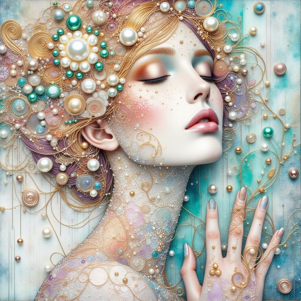 A delicate arrangement of lace, ribbons, and pearls with watercolor and alcohol ink textures. The artwork features metallic gold highlights, adding a touch of luxury.