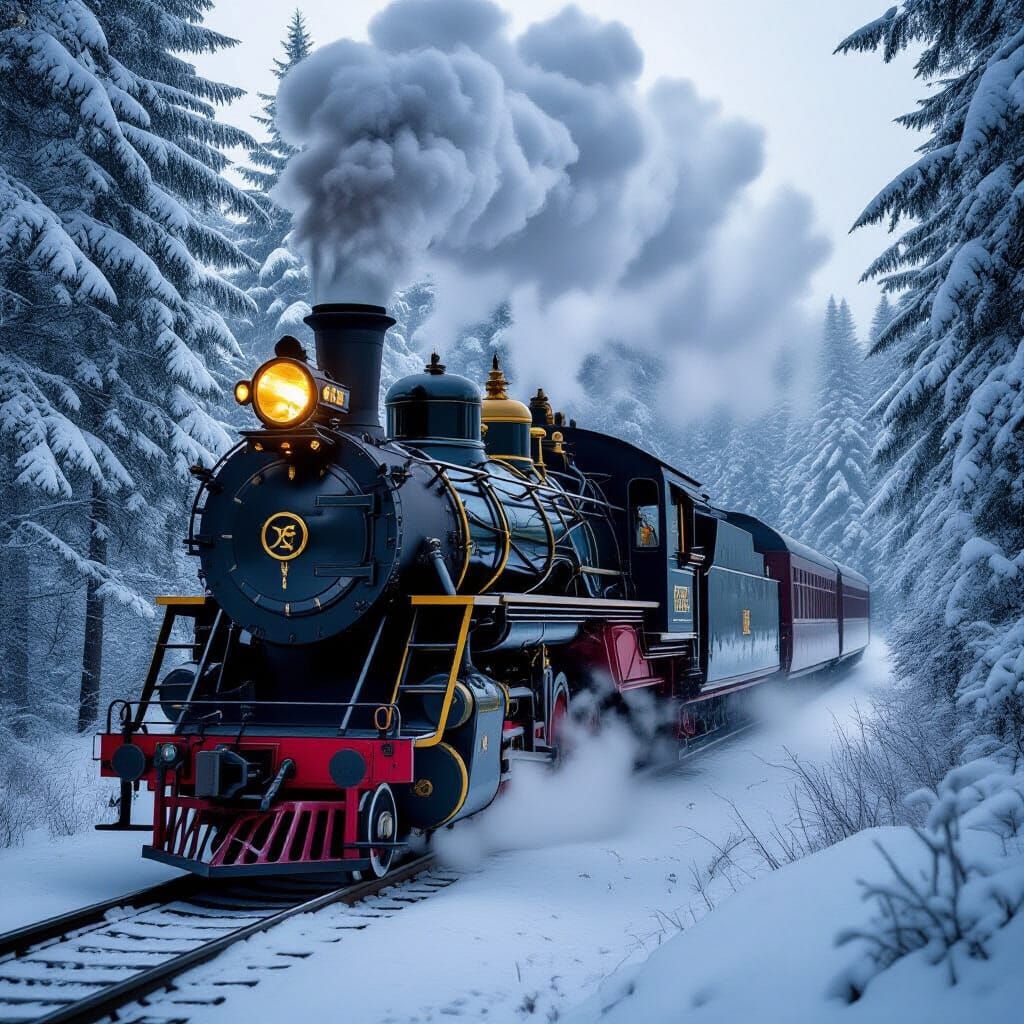 A vintage steam train with brass pipes travels through a snow-covered pine forest. Mystical fog surrounds the tracks, and warm lights glow from the windows, creating a scene of isolation and beauty in a hyper-realistic steampunk style.