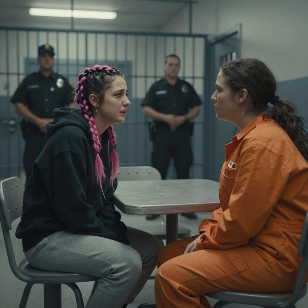 A dramatic cinematic film still captures a punk girl with pink and black hair visiting her mother in prison. The scene is atmospheric with low, cinematic lighting and film grain.