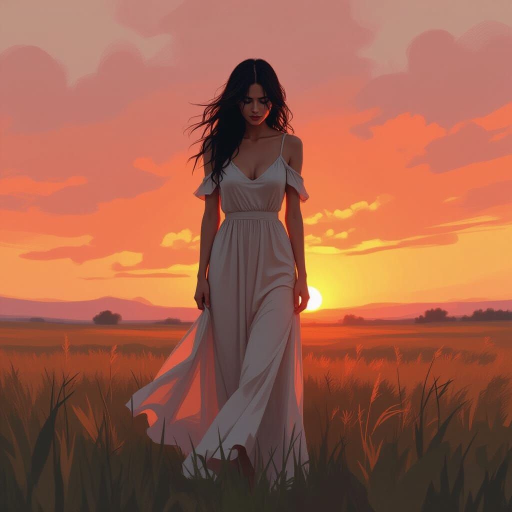 A dramatic image of a woman in a flowing dress silhouetted against a sunset while crying. Bold brushstrokes and muted colors create a digital art style.