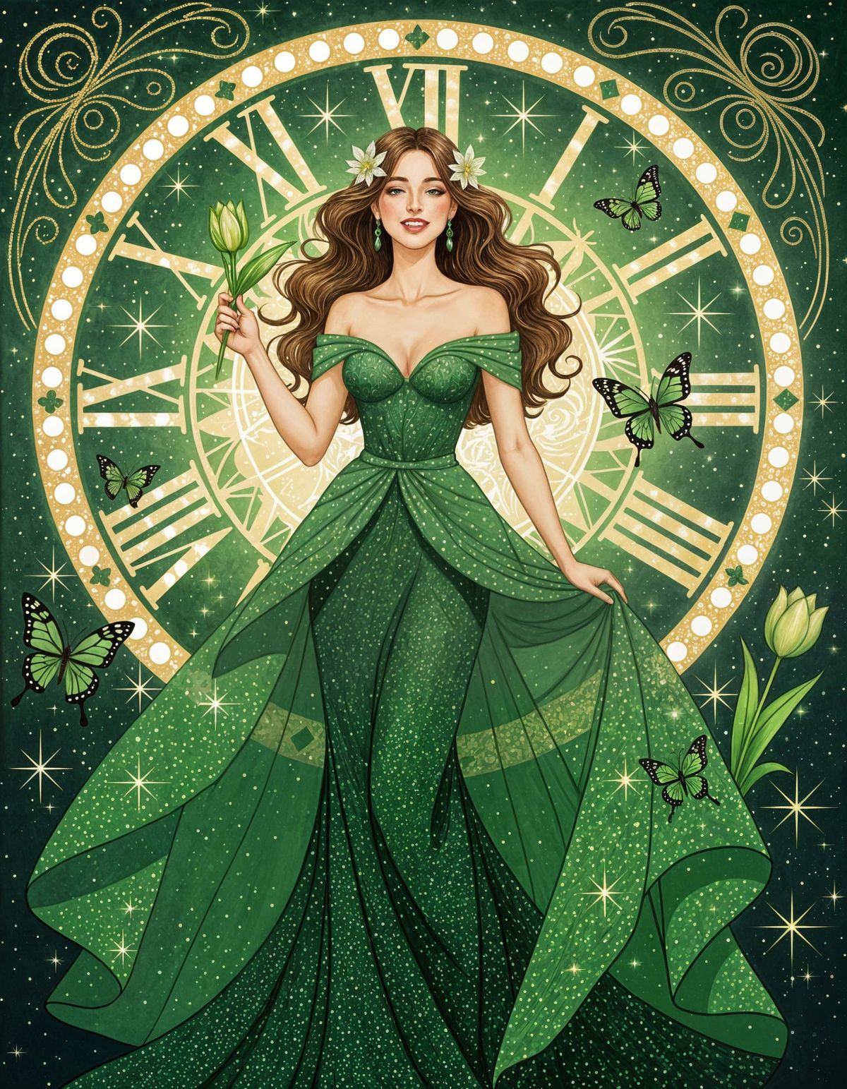 Bathed in luminous shades of emerald and jade, this artwork presents a timeless muse standing at the threshold between nature and eternity. Encircled by an ornate clock face, she becomes the embodiment of green’s quiet power—growth, renewal, and harmony with time itself. Selective green tones dominate her flowing gown, blooming tulips, and delicate butterflies, while soft golden accents shimmer like stardust against a muted backdrop. Every curve and ornament echoes Art Nouveau elegance, transforming the scene into a visual poem where time pauses, nature breathes, and serenity reigns.