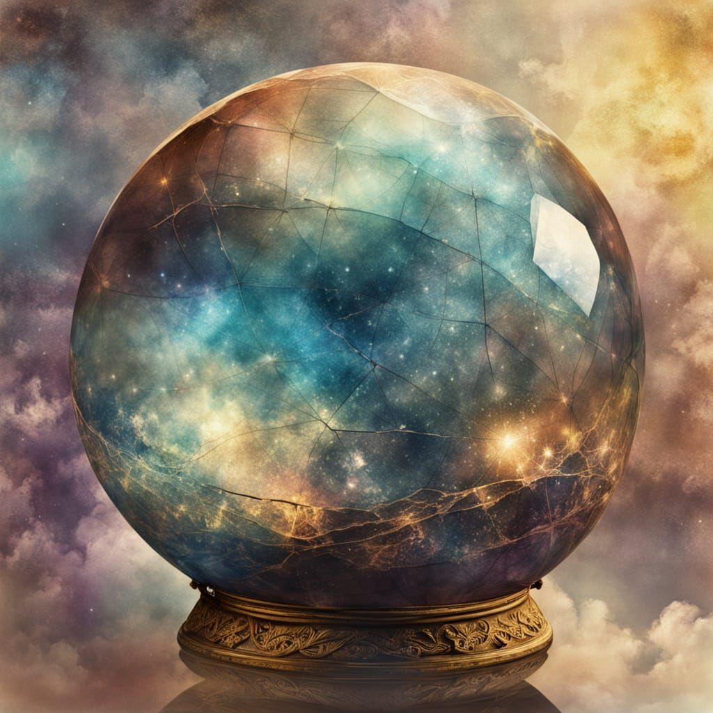 This image shows a magical world contained within a cracked sphere, complete with crystal balls and tarot cards. The fantasy art is rendered in watercolor style with iridescent effects and soft lighting.
