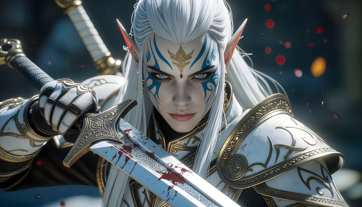 A hyperrealistic image of white-skinned battle elves adorned with blue facial tattoos and ornate white and gold armor, wielding a blood-tipped sword. Masterpiece of atmospheric, high-contrast digital art.