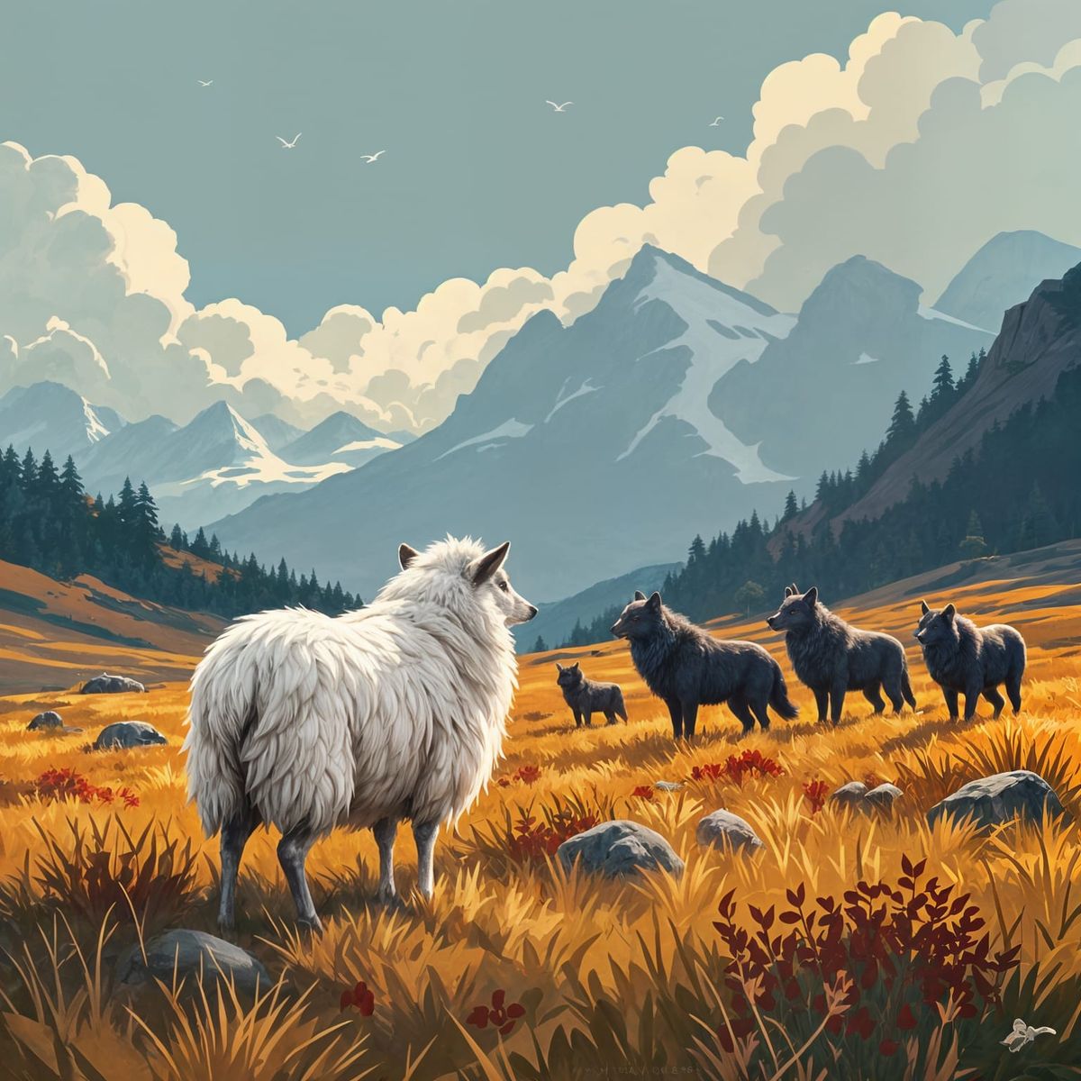This image shows a fluffy, sheep-like creature walking away from a pack of dark wolves. The scene features precise detailing, textures, and a fantastical landscape with deep, complementary colors, in a digital art style.