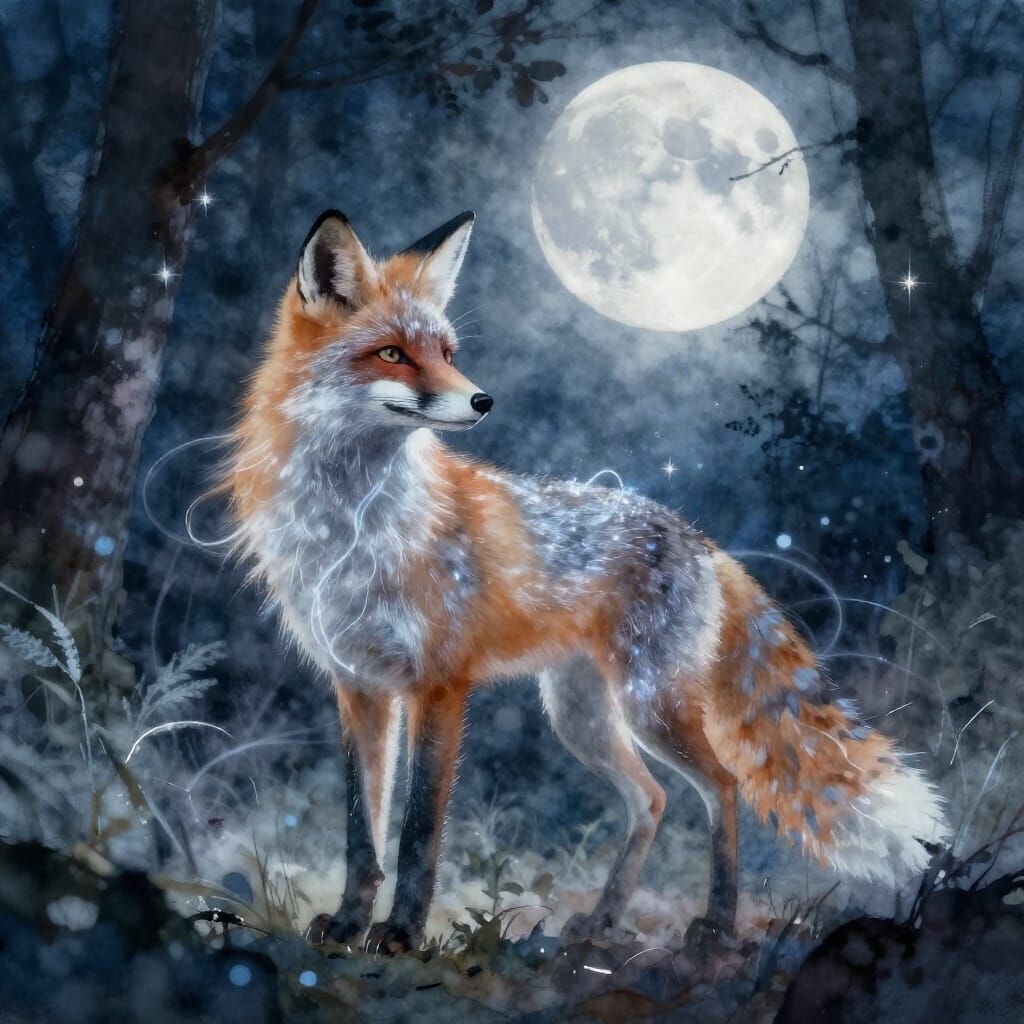 This image captures a mystical fox shimmering with celestial light in a moonlit forest, rendered in a watercolor style with dramatic lighting and soft bokeh.