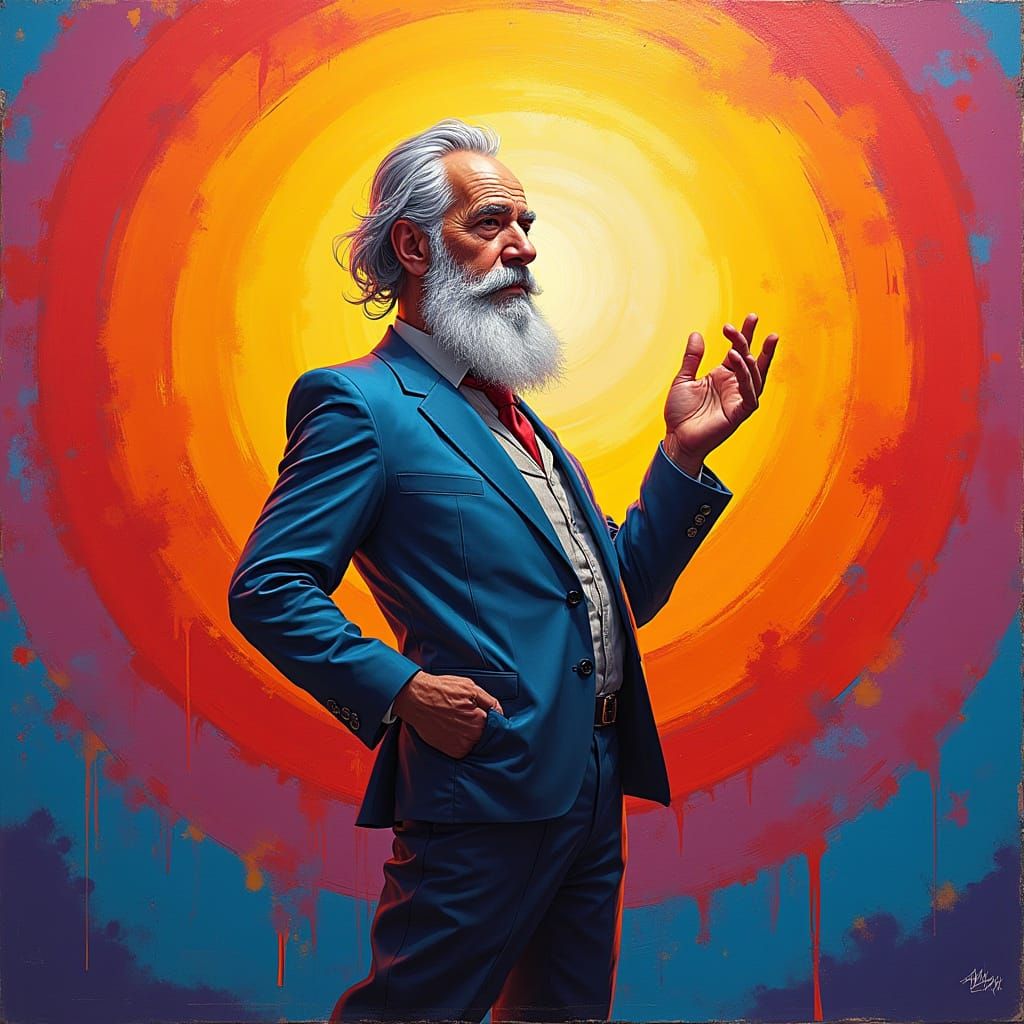 This image features a physical education teacher against a bright, radial gradient background. Created in a 3D digital art style, it blends abstract graffiti and fine details with complementary colors.