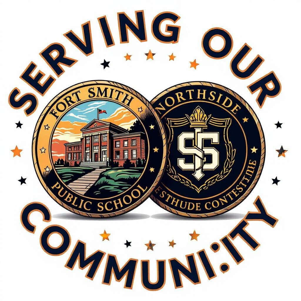 This image shows a commemorative coin featuring the Fort Smith Public School logo on one side and the Northside JROTC logo on the other. The words 'Serving our community' encircle the design in digital illustration style.