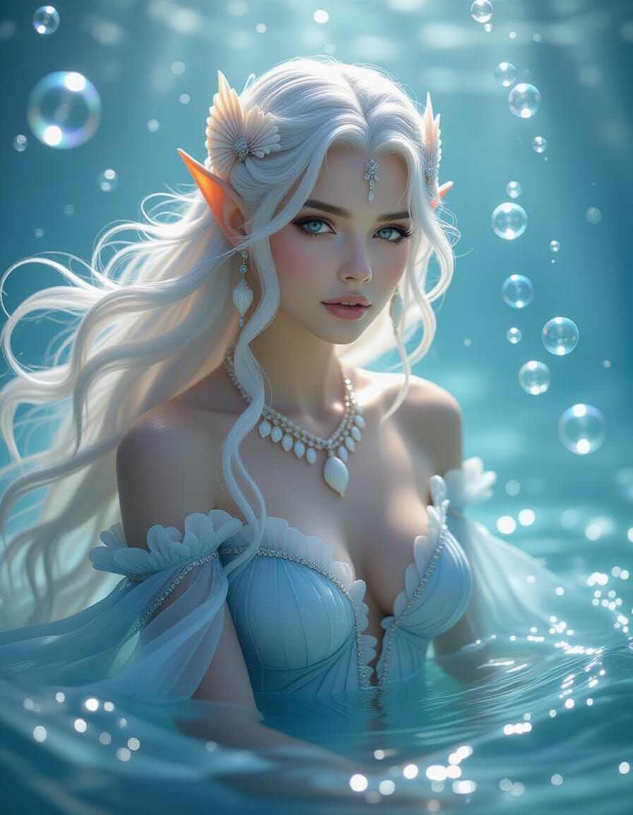 This image showcases a gorgeous Water Elf with wave-like garments and liquid-like hair, adorned with seashell jewelry. Ethereal underwater lighting and magical bubbles create a serene, mysterious scene with intricate detail.