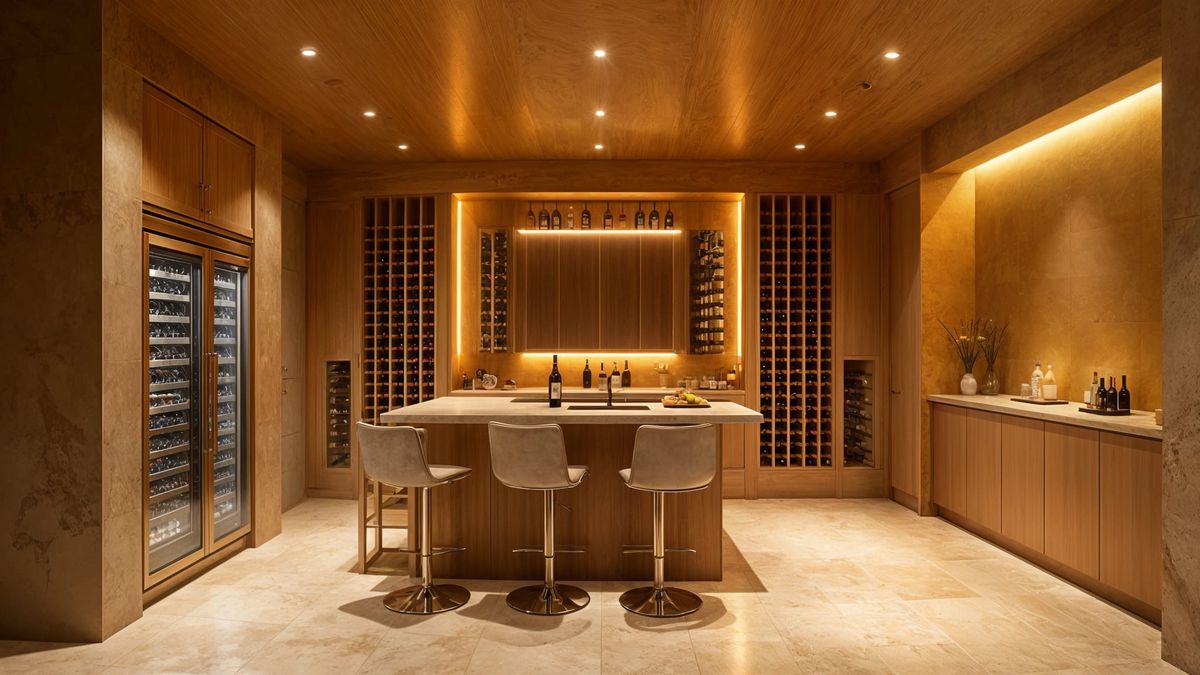 This image shows a luxurious, futuristic basement wine cellar with an integrated mini bar in warm, sandy tones. The cinematic design features a large wine rack, glass-fronted fridge, and cozy amber lighting.