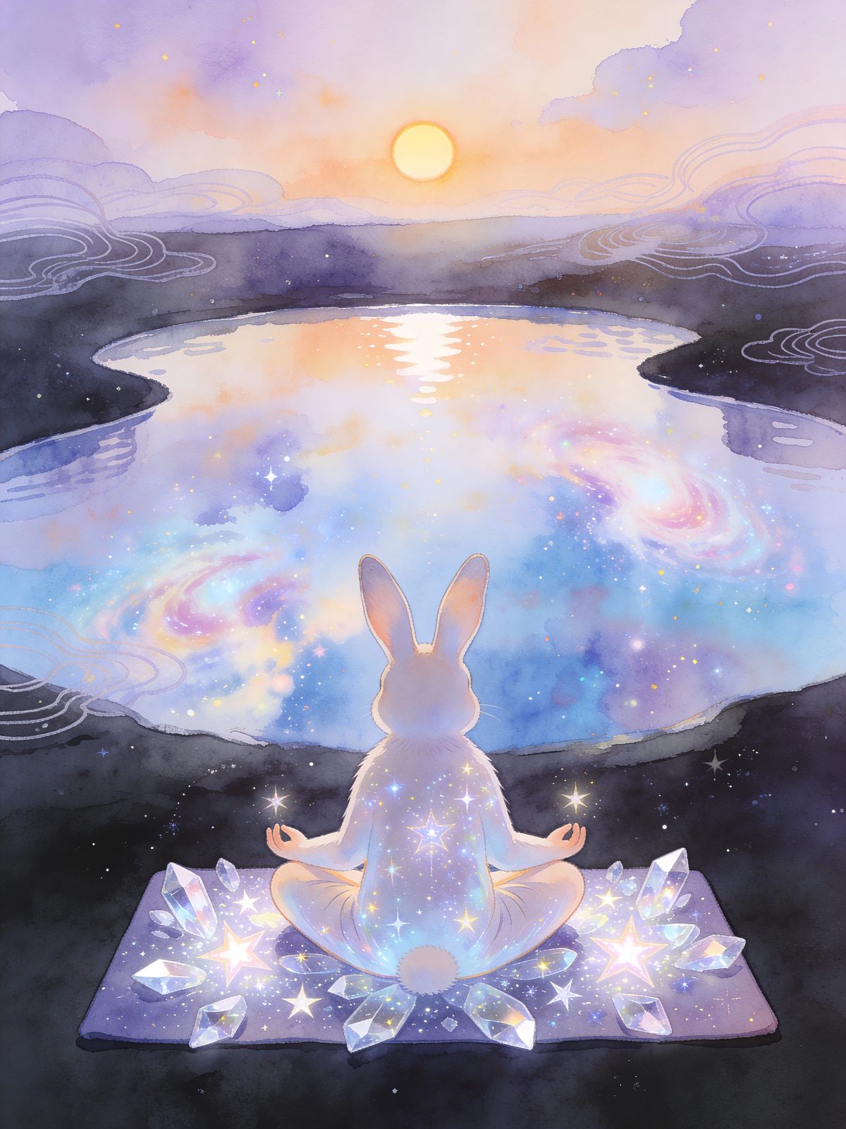 This image depicts a tranquil rabbit meditating by a reflective pond under a pastel nebula sky. A gentle sun rises, symbolizing a new beginning, rendered with dreamlike watercolor and cosmic elements.