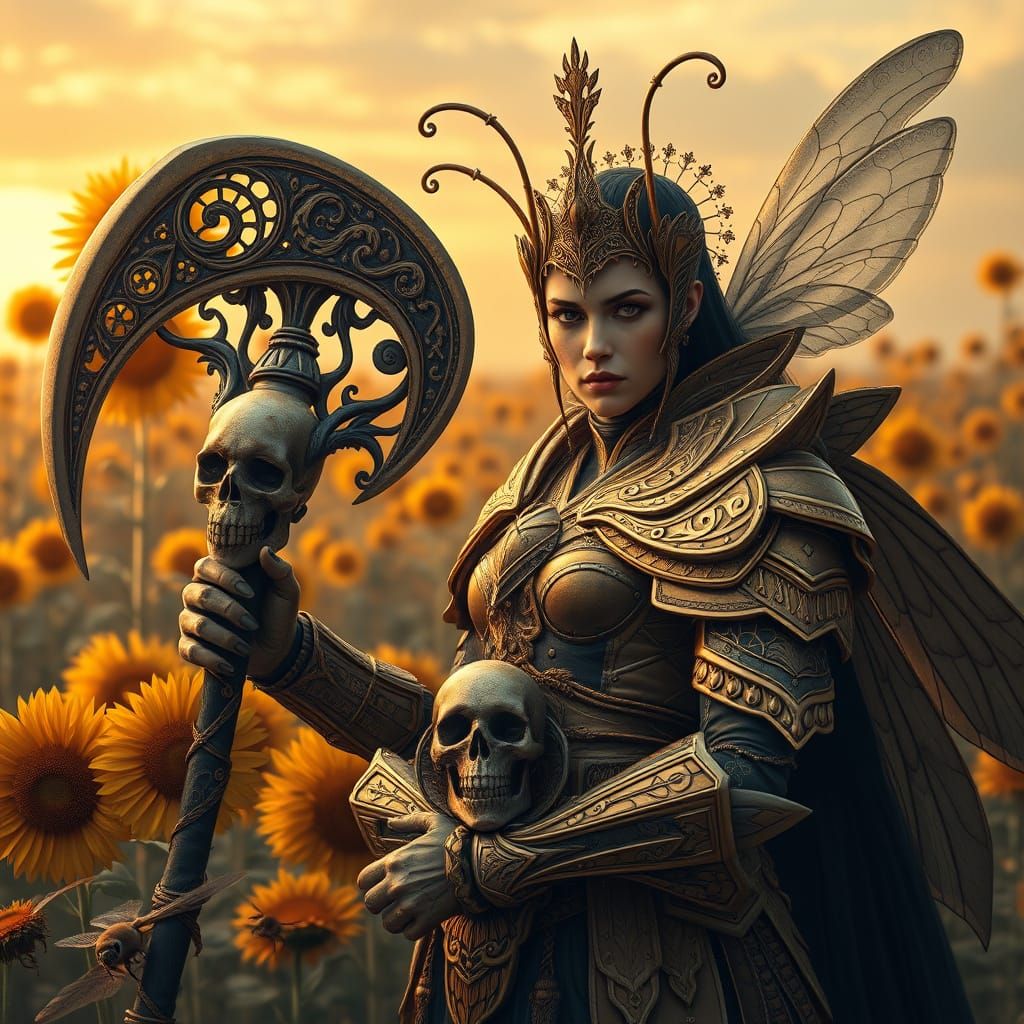 A stunning digital painting of a regal bee queen, inspired by honeycombs and insect anatomy, standing amidst a field of sunflowers, wearing ornate armor and delicate bee wings, surrounded by swirling bees and intense, commanding eyes.