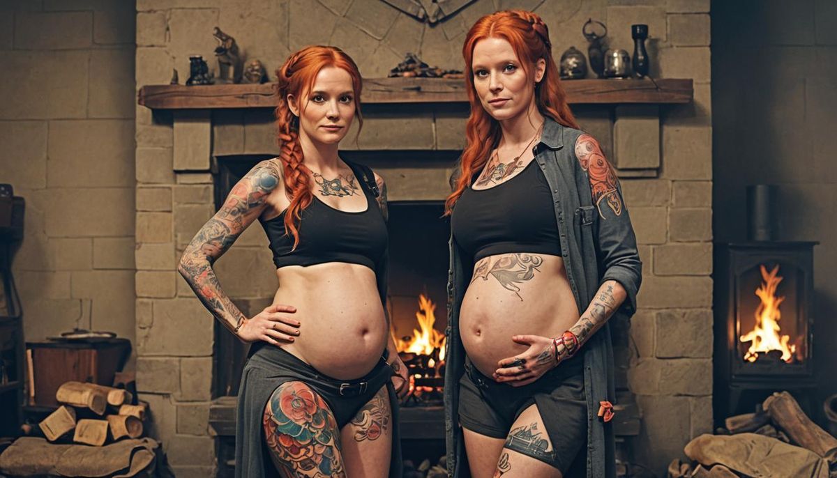 This image shows three women with tattoos, one with a large pregnant belly. The picture is highly detailed with cinematic lighting, reminiscent of a film still.