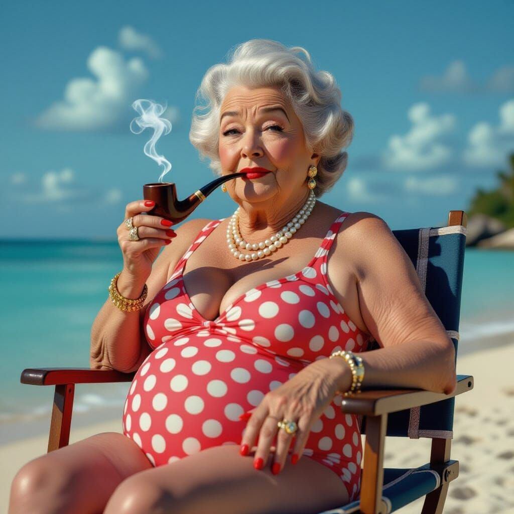 This striking image features a 90-year-old pregnant grandmother in a polka-dot swimsuit, smoking a pipe on a director's chair by the sea. Her face is detailed with makeup and jewelry, captured in a 35mm film aesthetic with cinematic lighting.