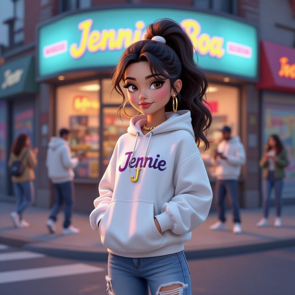 This image shows a girl in a 'Jennie' hoodie, jeans, and Air Force sneakers, standing on a street corner. The scene, rendered as 3D digital art, features Pixar and Disney-inspired hip-hop aesthetics and cinematic lighting.
