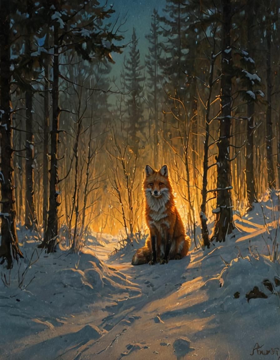 A striking picture of a fox watching the sunset in a dark winter forest. The warm light creates long shadows and illuminates the snow and icicles in a baroque style.