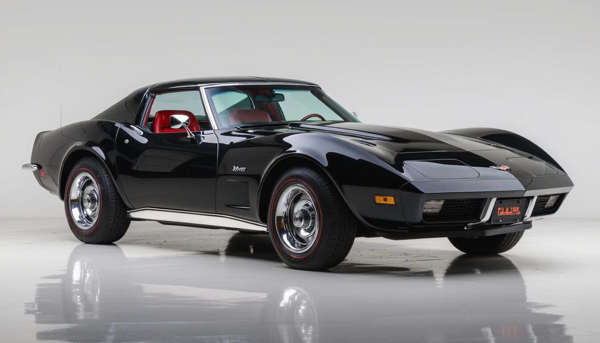 This image showcases a glossy black 1974 Chevrolet Corvette C3 Stingray in a showroom. Photorealistic studio lighting highlights its detailed interior and iconic bodywork from the front right side.