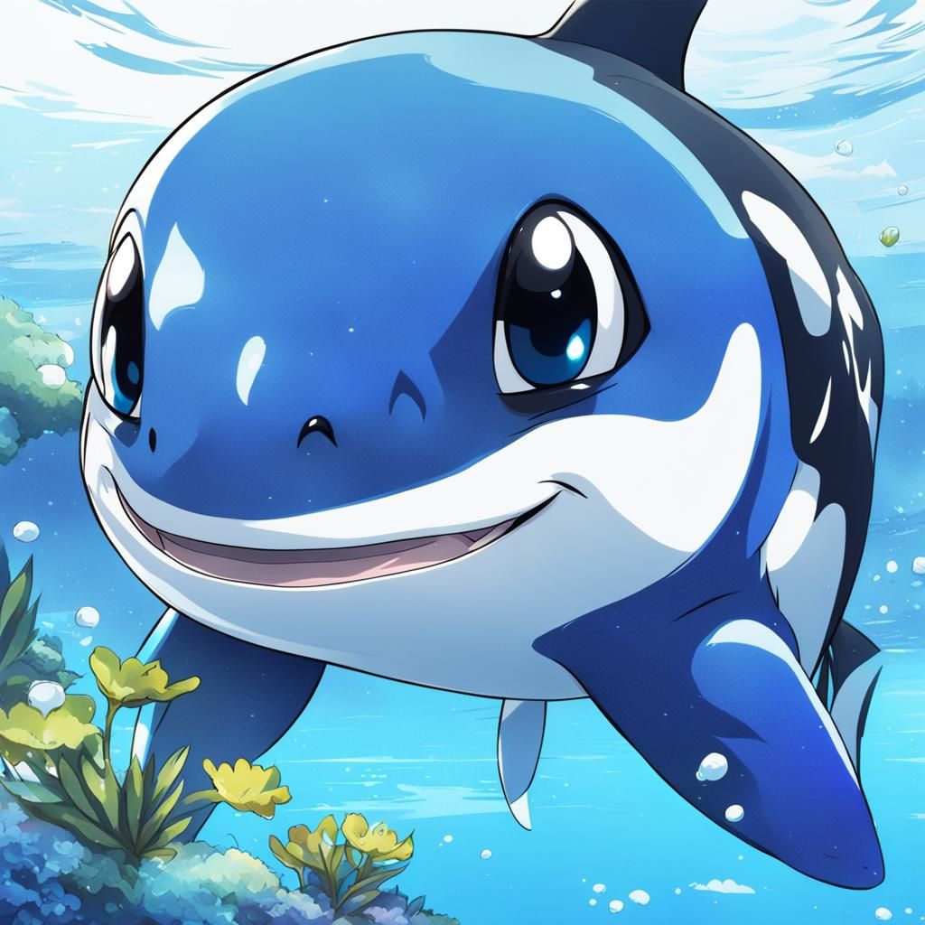 This image shows a cute orca in an anime style. The artwork is reminiscent of Japanese manga, anime key visuals, and fan art from platforms like Pixiv and Zerochan.