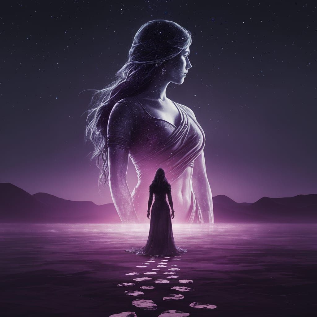 This enchanting image features a South Asian woman in a sari, surrounded by a star-filled night sky, with a path of footprints formed by her silhouette. Created in a blend of watercolor and ink aesthetics, the scene is a masterpiece of composition, with deep blues and silvers dominating the hues.