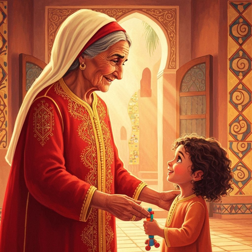 A vibrant image of an elderly Moroccan woman in traditional dress greeting her granddaughter in a sunlit riad. The artwork has a colorful, geometric, and patterned aesthetic.