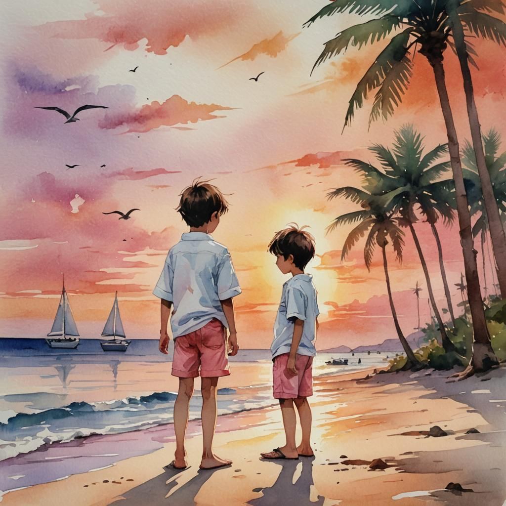 This image shows a child on a beach at sunset. The artwork features a sailboat, palm tree, and seagulls under an orange and pink sky. Rendered in a soft, dreamy watercolor anime style.