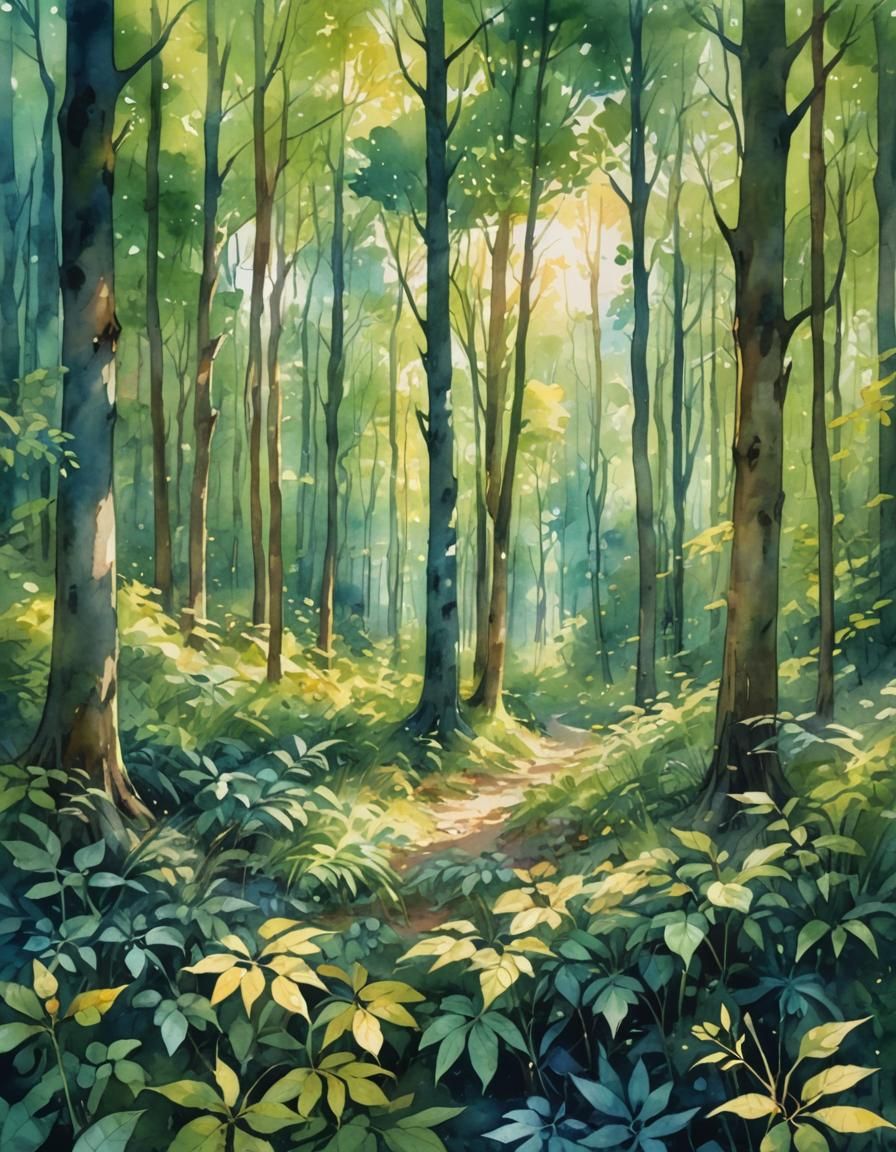A captivating image of a sun-drenched magical forest in summer. The vibrant watercolor style, layered textures, and deep, rich colors evoke a sense of wonder and tranquility. Soft, warm light filters through the dense foliage.