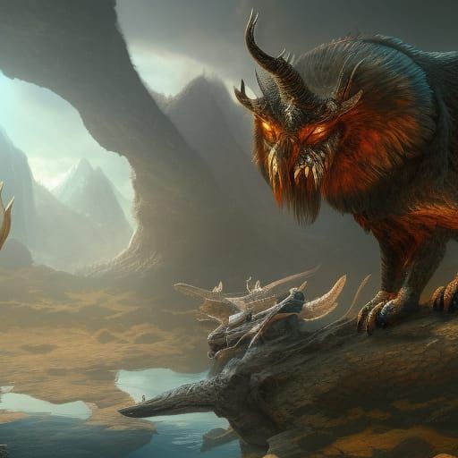 This image shows a group of animals in a detailed matte painting. The artwork features deep colors, intricate details, and complementary color schemes, rendered as fantasy concept art.