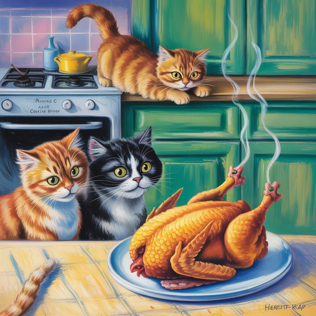 This image shows a cozy kitchen scene with three Persian cats captivated by a cooling chicken. Rendered in pastel chalk, the artwork evokes romanticism and pointillism with impressionistic influences.