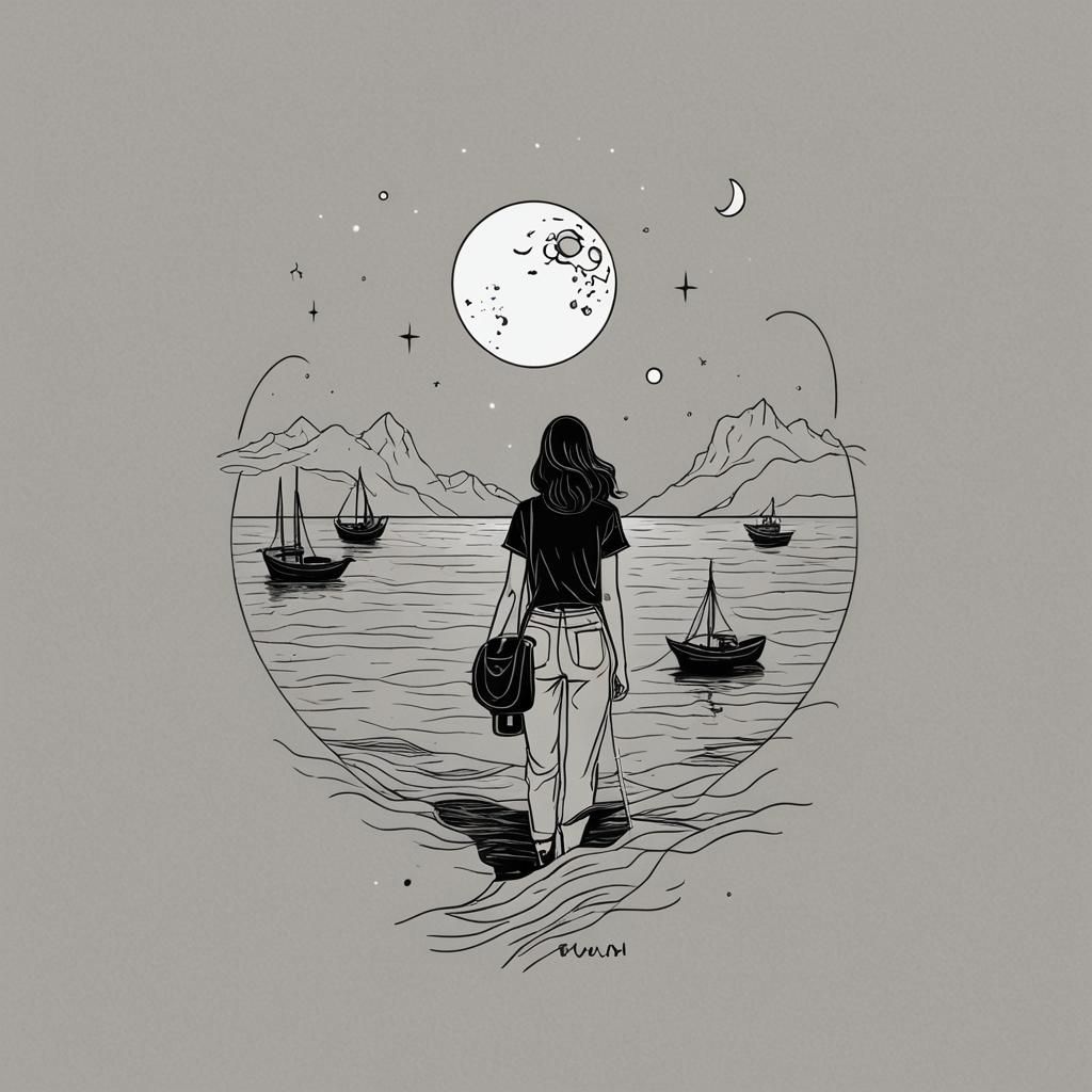 This image features minimalist black line art t-shirt designs. Themes include the moon, ocean, boats, and a young woman, rendered as simple and elegant line drawings.
