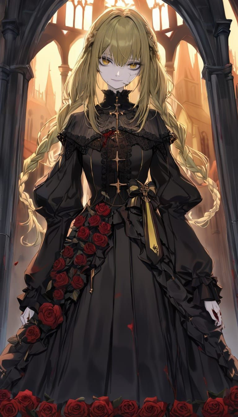 "1girl, bishounen, pale skin, yellow eyes, bags under her eyes, cracks on her face, looking at the viewer, light smile, absurdress, high quality"