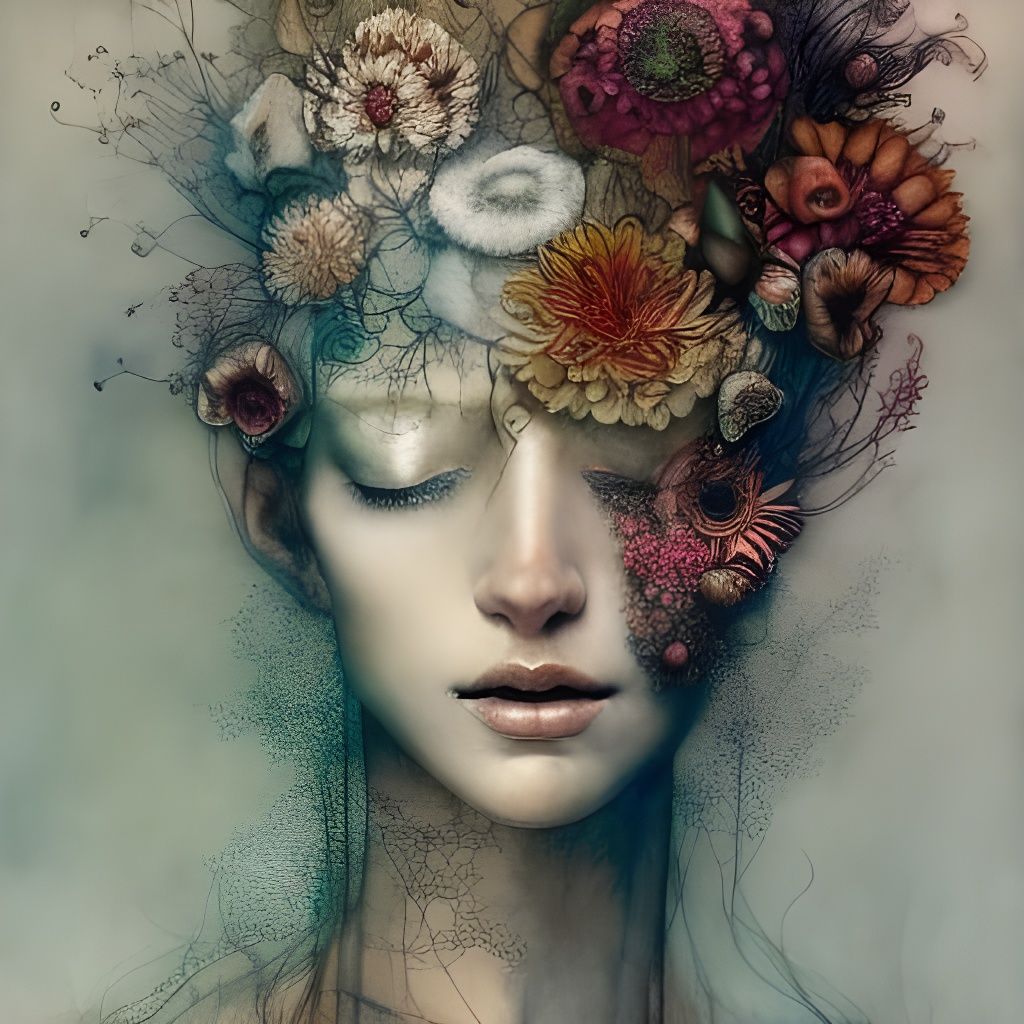 This image shows a double exposure of a ballerina intertwined with nature. Floral elements, mushrooms, geometric patterns, and wires create an insanely detailed mixed-media collage with dramatic lighting.