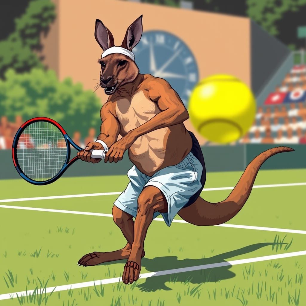 A powerful kangaroo playing tennis at Wimbledon, wearing athletic shorts and a headband. The image showcases bold lines and vivid colors in a vibrant, dynamic scene.