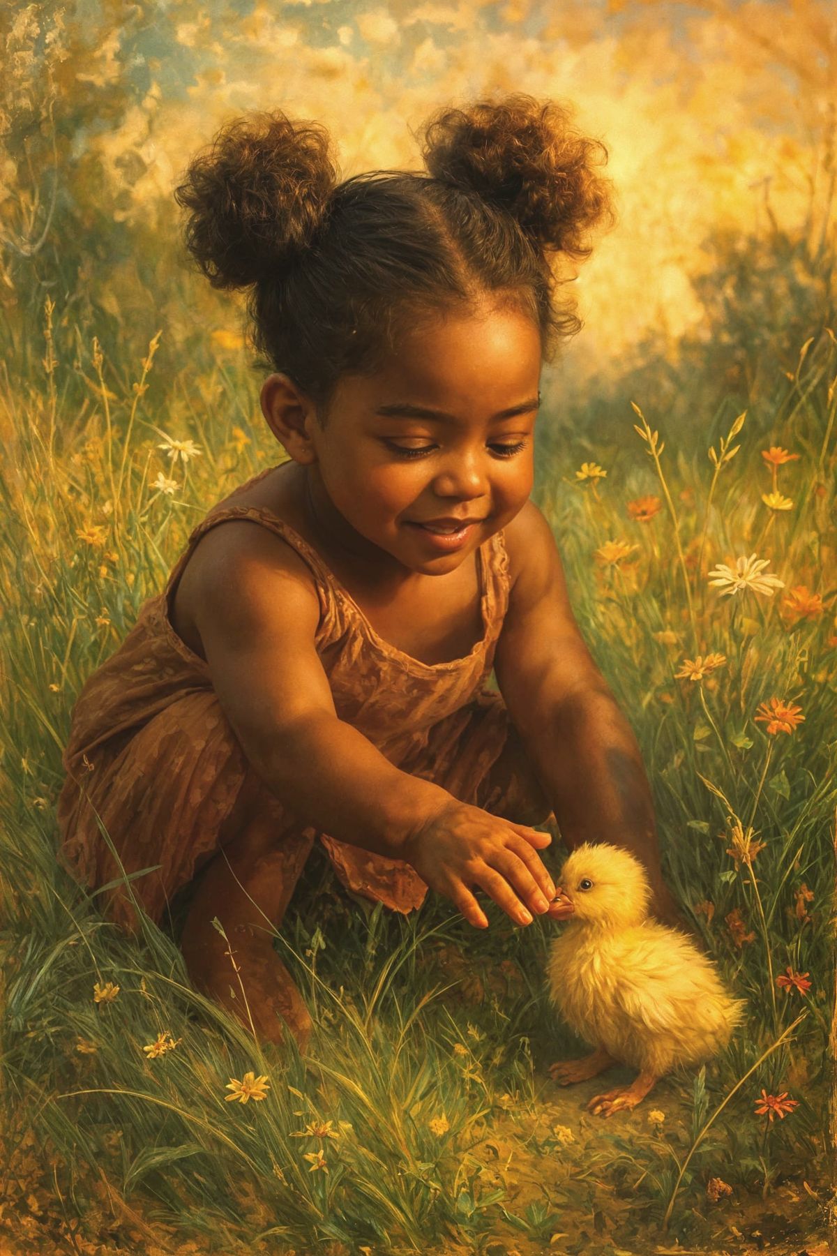 Intricately detailed fine art oil painting of a toddler with dark skin and hair pulled into afro buns. The toddler is crouched on the ground surrounded by high grass and wild flowers, happily petting a tiny fluffy yellow duckling. Thick detailed visible brushstrokes, rich color palette with vibrant colors. ...