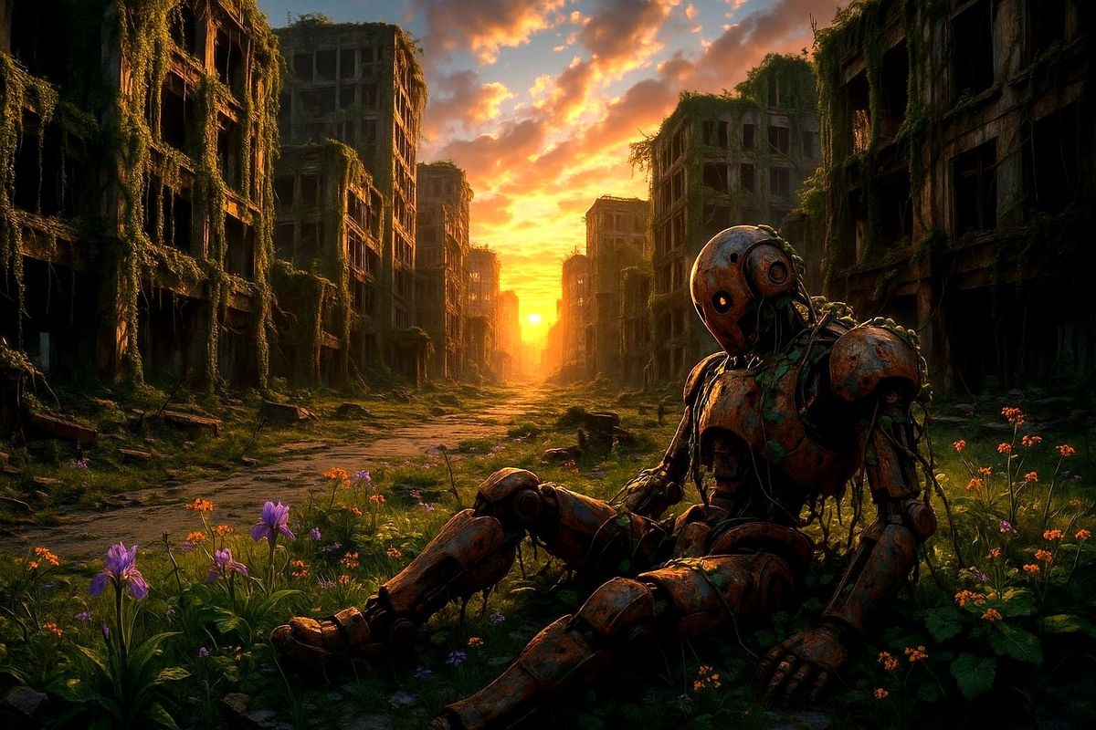 This image shows a photorealistic post-apocalyptic cityscape where nature reclaims urban ruins. A rusted robot sits among the overgrowth and vibrant flowers, all illuminated by a stunning sunset.
