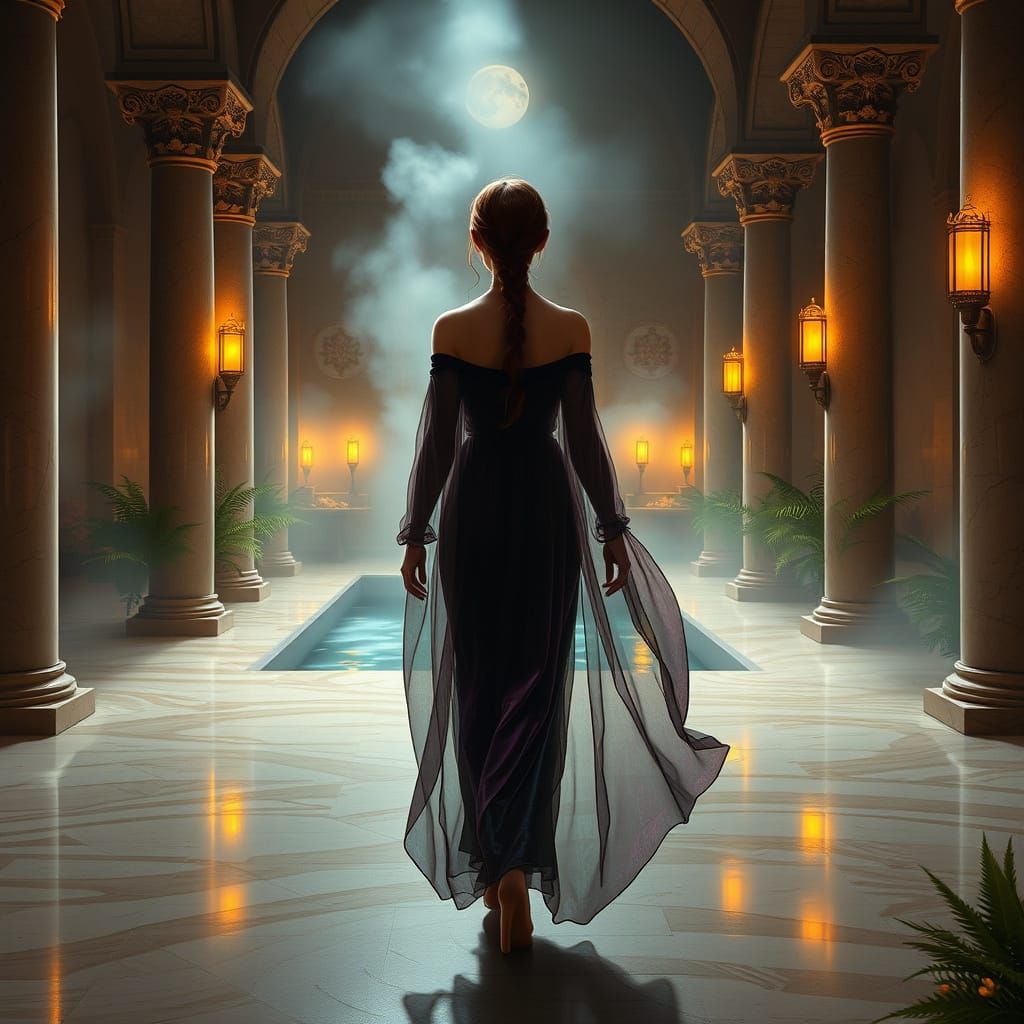 This image depicts a slender, medieval maiden draped in shimmering fabric, walking towards a mystical pool in a lavish bath, surrounded by lush ferns and vibrant flowers, with a soft, ethereal light and eerie mist creating an enchanting atmosphere, reminiscent of medieval mysticism and art nouveau detail...