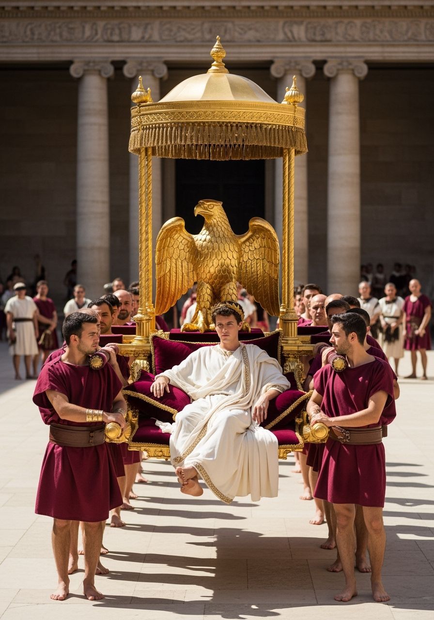 This image shows a young Roman emperor reclining on a golden eagle-shaped litter. The emperor is surrounded by servants in a sunlit courtyard, captured with a shallow depth of field and natural lighting.