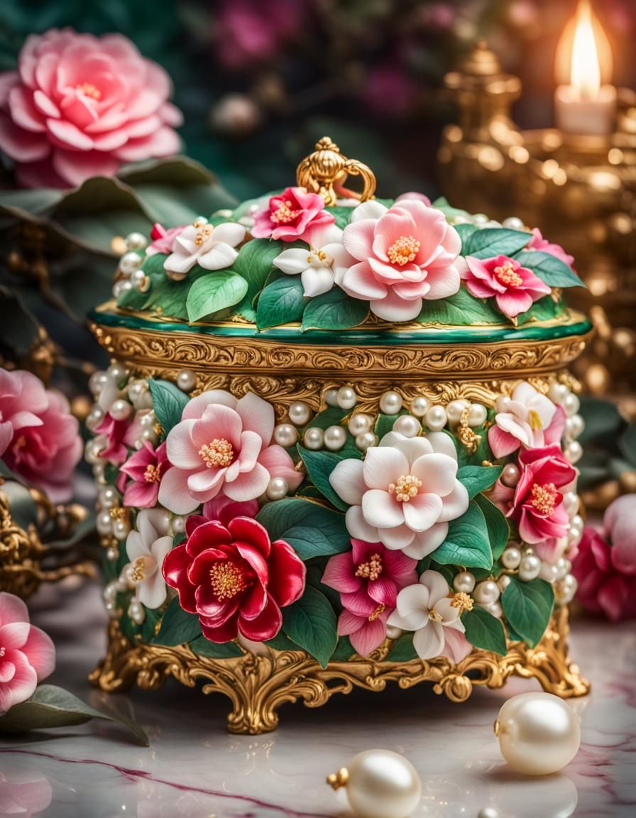 This image shows a luxurious rococo porcelain box adorned with carved porcelain camellias, jasmine, and lilies-of-the-valley. The photorealistic rendering features intricate details, bokeh, and natural lighting.
