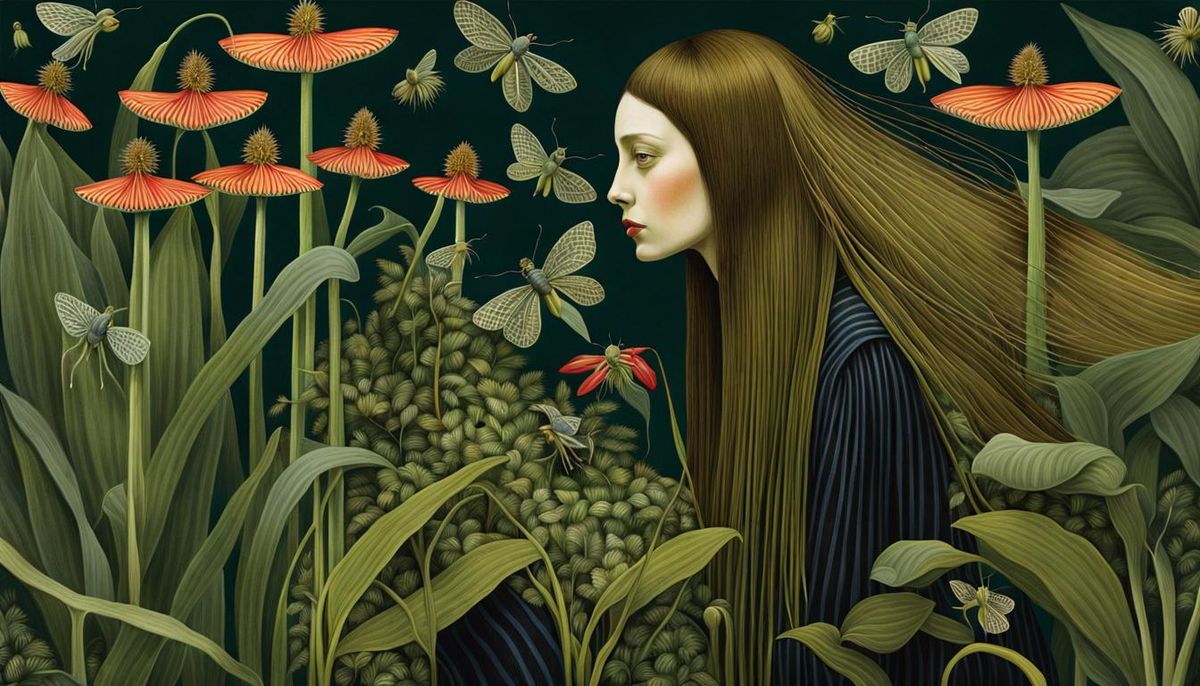 A striking digital artwork featuring a woman kneeling near a Bulbophyllum binnendijkii, set against a surreal sunset. The collage incorporates folklore elements, nature scenes, and inspirational quotes in a dreamlike style.
