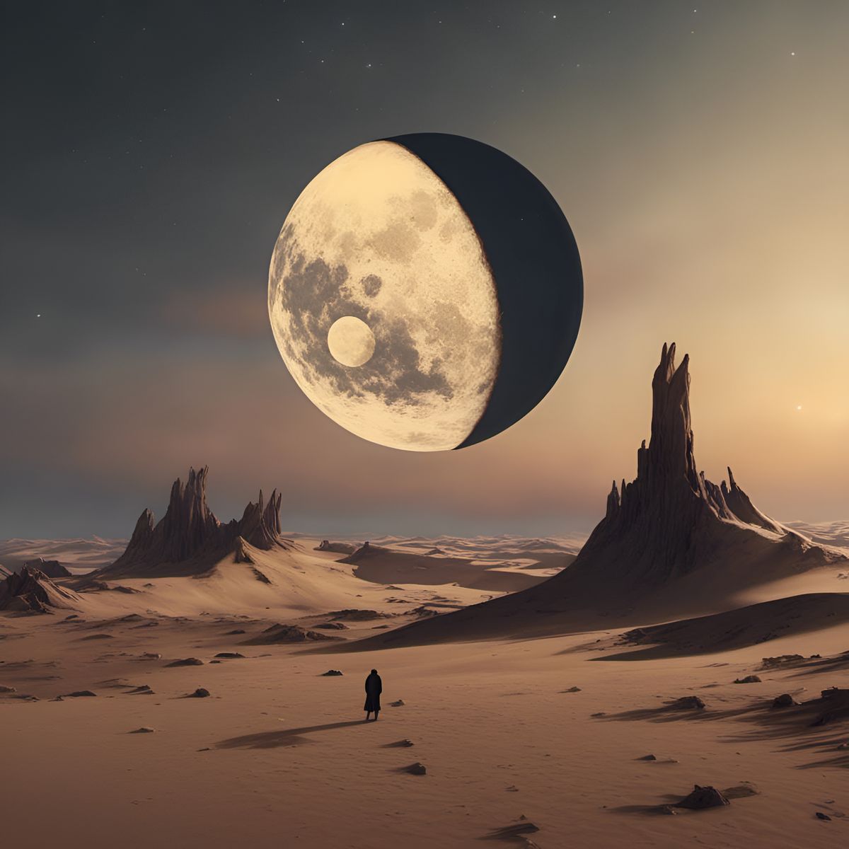 A dramatic scene of a skull-shaped moon descending over a desert landscape. The image evokes a sense of awe and dread, rendered with intricate detail and rich, deep color, in a fantastical digital painting style.