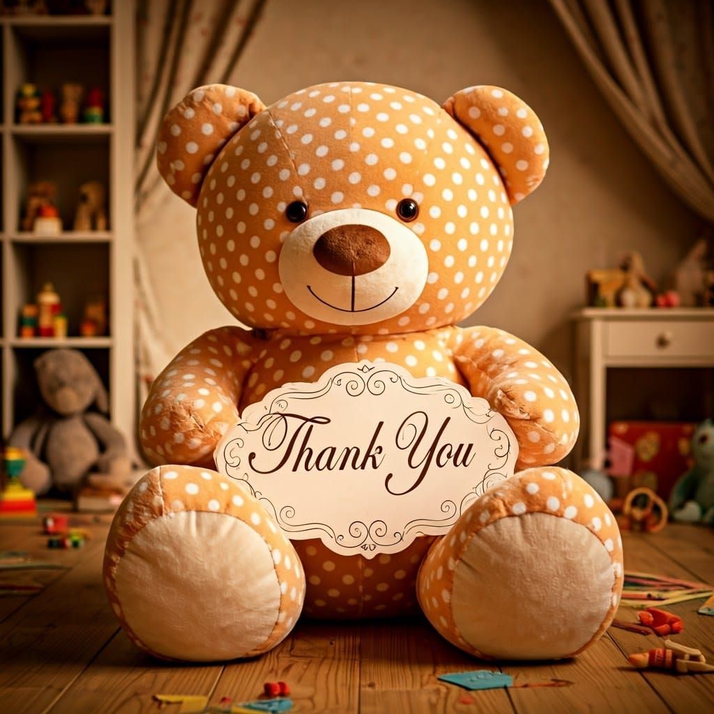 This image shows a gigantic, plush polka-dot teddy bear holding a "Thank You" sign, surrounded by tiny hearts. The bear sits in a cozy child's room filled with toys and books, in a charming illustration style.
