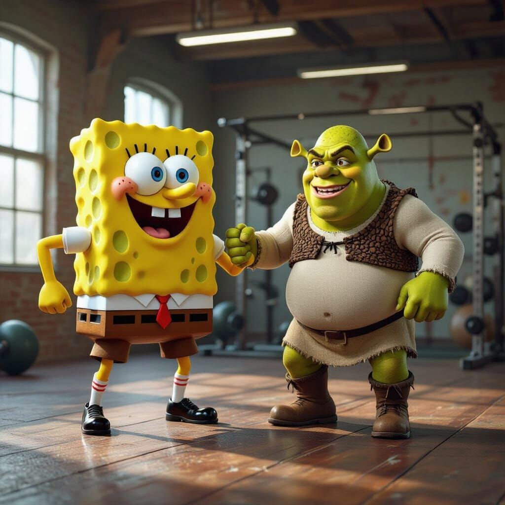 This image shows Spongebob in a gym lifting weights, while Donald Trump and Shrek jump over Mortadelo and Filemon. It's rendered in a hyperrealistic style with intense colors.
