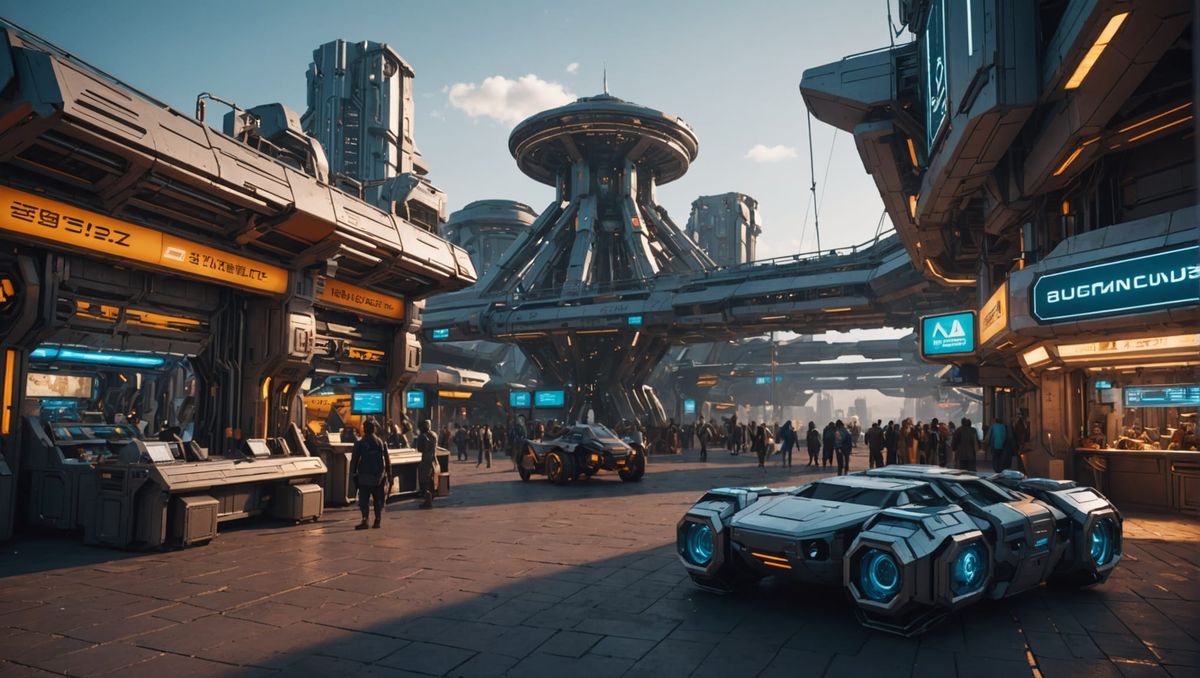 A vibrant marketplace set in a futuristic African landscape at dusk. The image features intricate mechanical details, polished metal textures, and a dramatic, cinematic atmosphere as 3D rendered digital art.