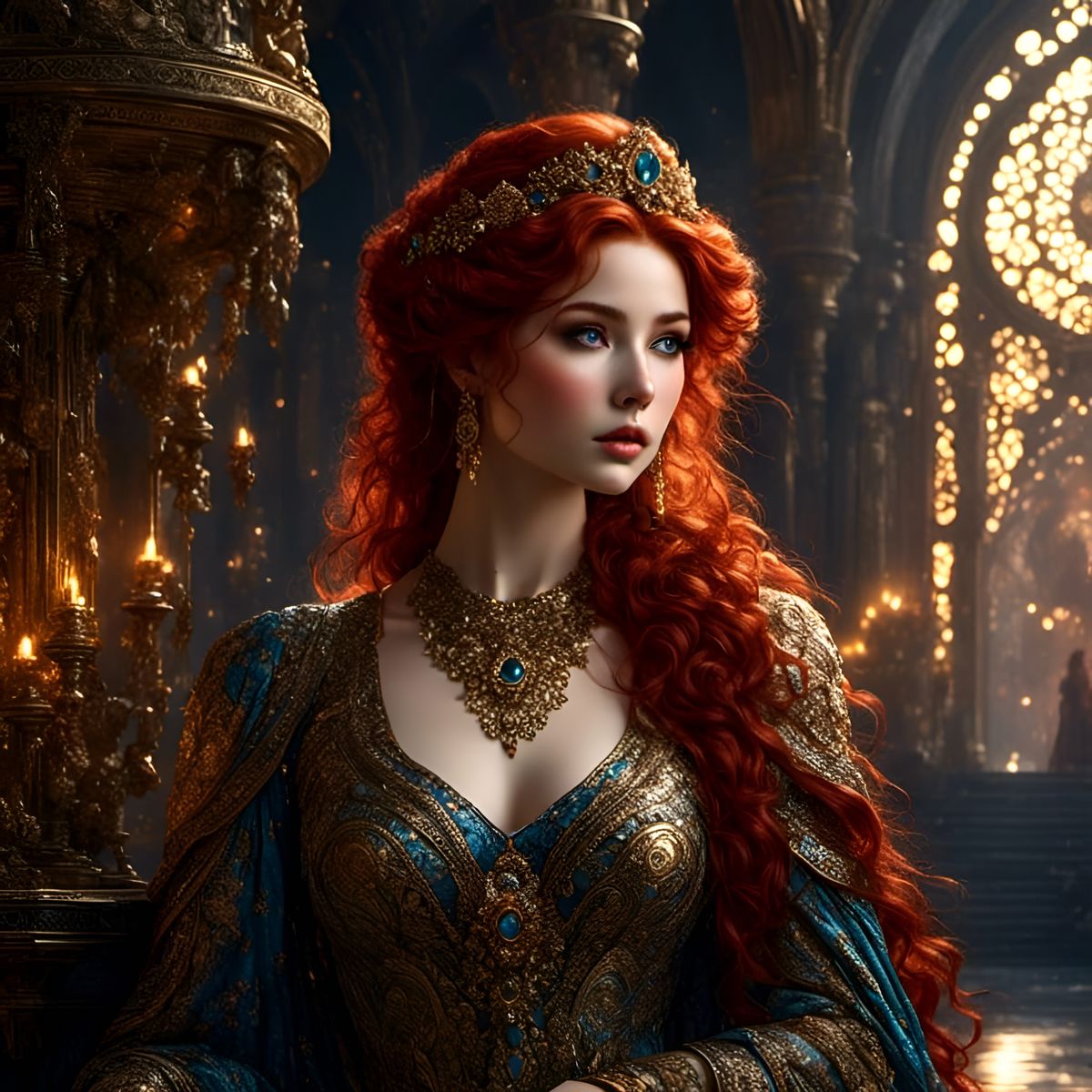 A digital portrait of a red-haired goddess, the daughter of fallen stars. The artwork features intricate details, soft lighting, and a hyperrealistic aesthetic, reminiscent of classical portraiture.