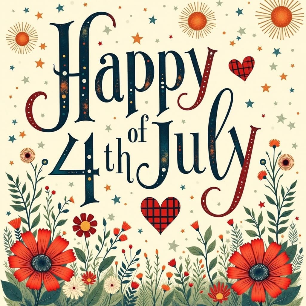 A festive 4th of July poster with decorative lettering and floral accents. The artwork combines polka dots, plaid, and quilted heart details in a children's book style with warm tones and soft lighting.