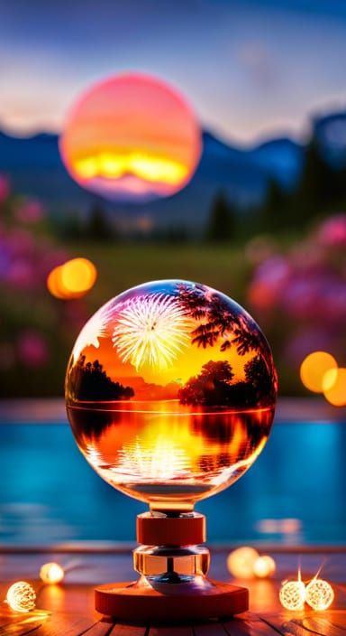 A hyperrealistic image of an elemental glass orb in a rural American landscape. The scene captures a dusk setting with fireworks, a swimming pool backdrop, and a bokeh effect. The aesthetic is photorealistic with magical, golden lighting.