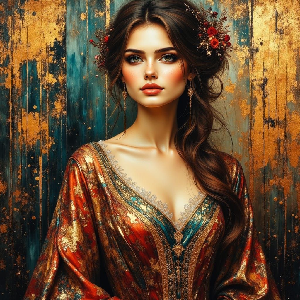 This image showcases an elegant lady in a regal portrait, featuring rich, textured brushstrokes and opulent gold leaf, inspired by classic painting techniques.