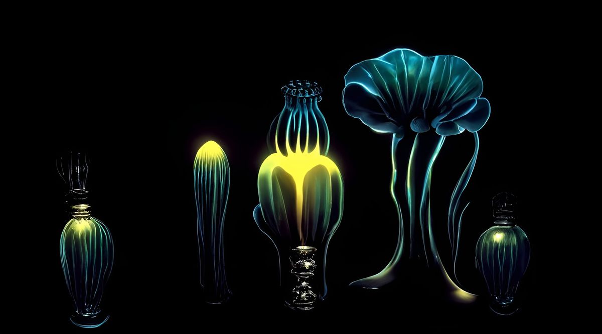 A mesmerizing display of bioluminescent organisms in a dark, organic environment. Volumetric lighting and shadow depth enhance the translucent forms in this minimalist digital rendering.